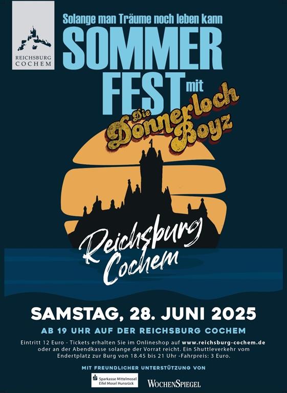 Wahnsinn, wir dürfen erneut am Samstag, den 28.06.2025, ab 19:30h, auf der Reichsburg in Cochem aufspielen. Tickets erhaltet Ihr hier für 12 € oder an der Abendkasse, falls noch verfügbar.