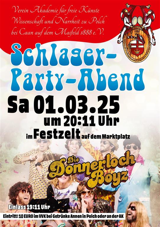 Die Kapelle spielt am Samstag, den 01.03.2025, um 21:00 Uhr, auf der Schlager-Party, im Festzelt in Polch auf dem Marktplatz. Kommt vorbei und tanzt mit uns – Polch Helau!