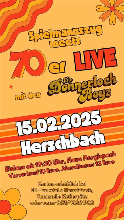 die Kapelle spielt am Samstag, den 15.02.2025, ab 21:00 Uhr, in 56249 Herschbach (WW) in der Festhalle „Haus Hergispach“. Achtung, es kann nur ein Herschbach geben zählt nicht, wir reden hier von Herschbach bei Selters!